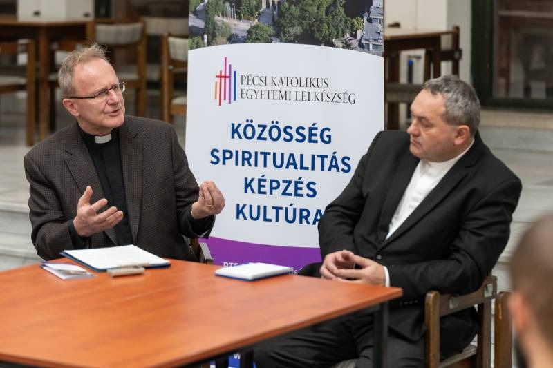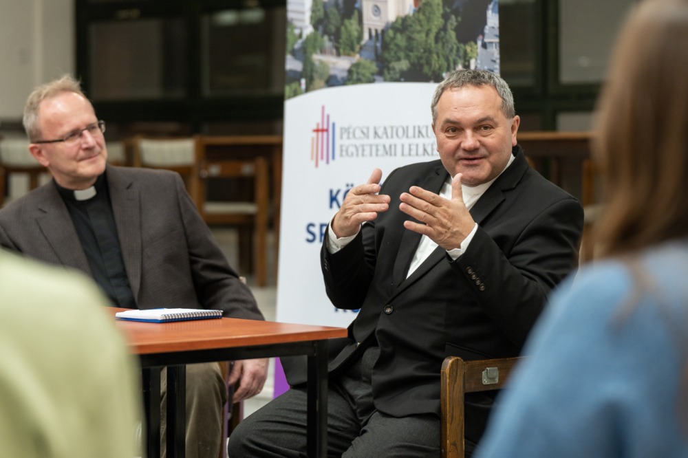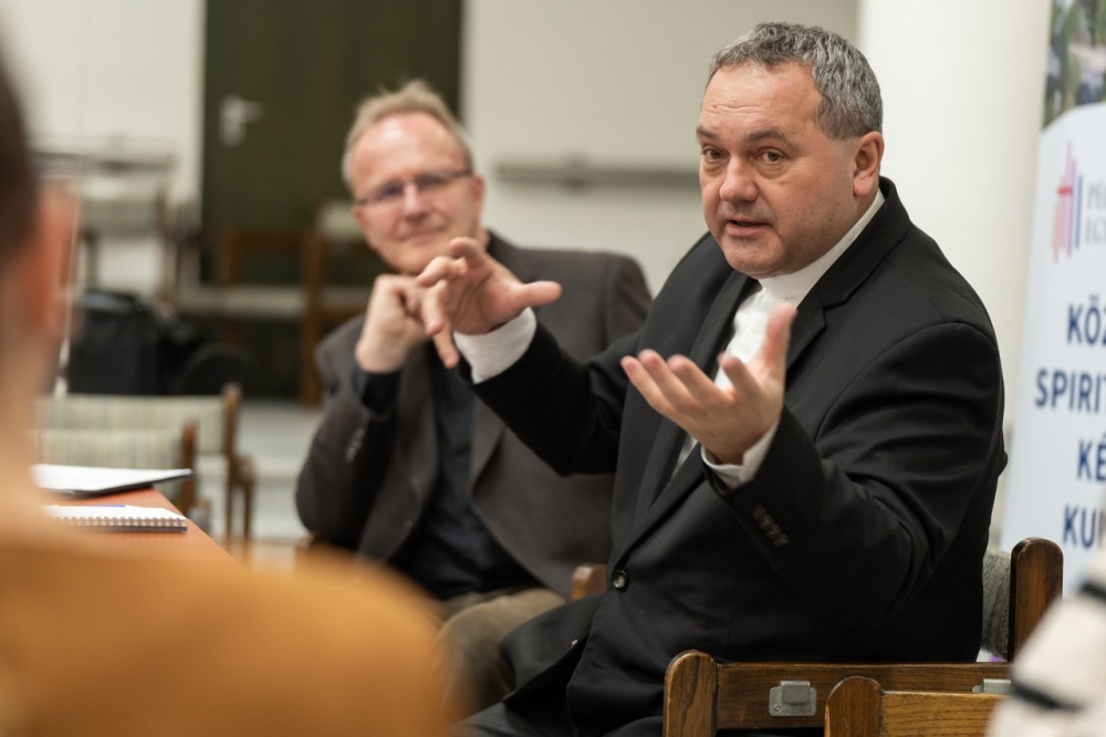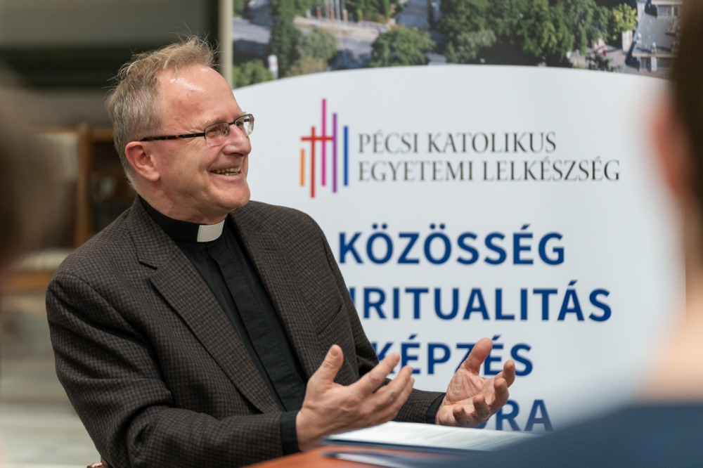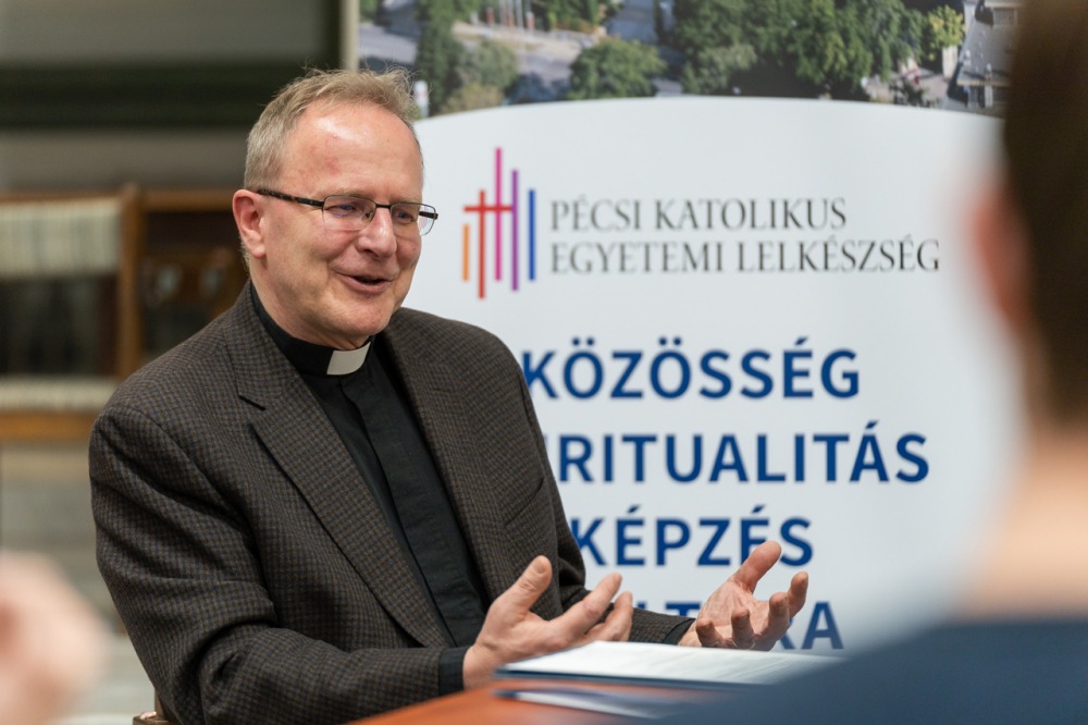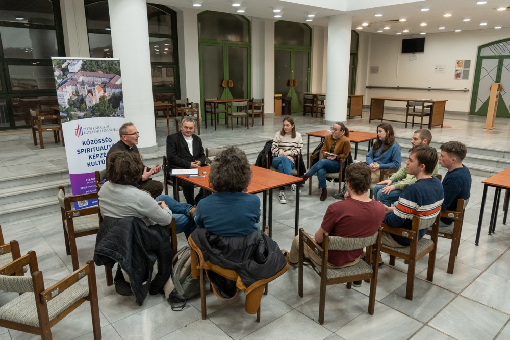 Az érdeklődők számára szűkösnek bizonyult a közelmúltban átadott lelkészségi szoba, így az épület előcsarnokában alakítottak ki egy rögtönzött beszélgetősarkot. A helyzet már önmagában is szimbolikus jelentőséggel bír, mely érdekes módon a jövő egyházának vízióját vetíti elénk: reagál a felmerülő helyzetre, nyit és megszólítja az embereket – fogalmazott Forrai Tamás atya. A jezsuita egyetemi lelkész köszöntőjében elmondta, a PEKEL sokféle programot szervezett az elmúlt hónapokban, közben pedig a segítőkben megfogalmazódott az a vágy, hogy az informális előadások mellett szükség van kötetlen, kétoldalú beszélgetésekre, melyek első állomására a pécsi főpásztort hívta meg az egyetemi lelkészség.
