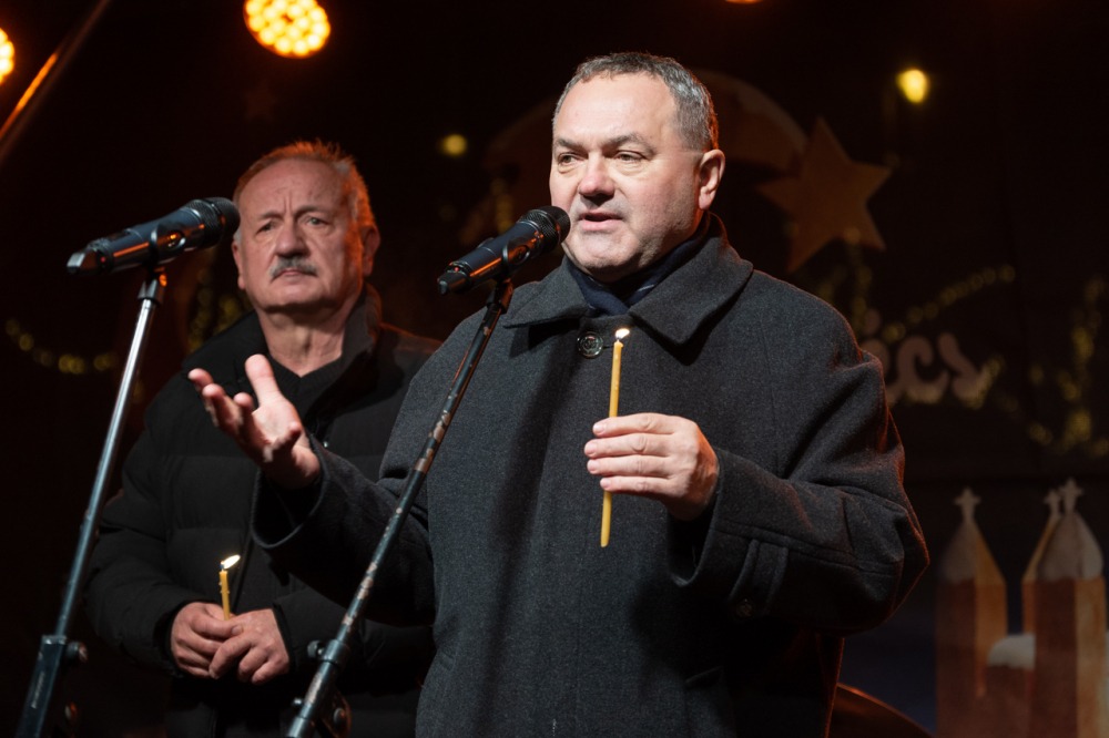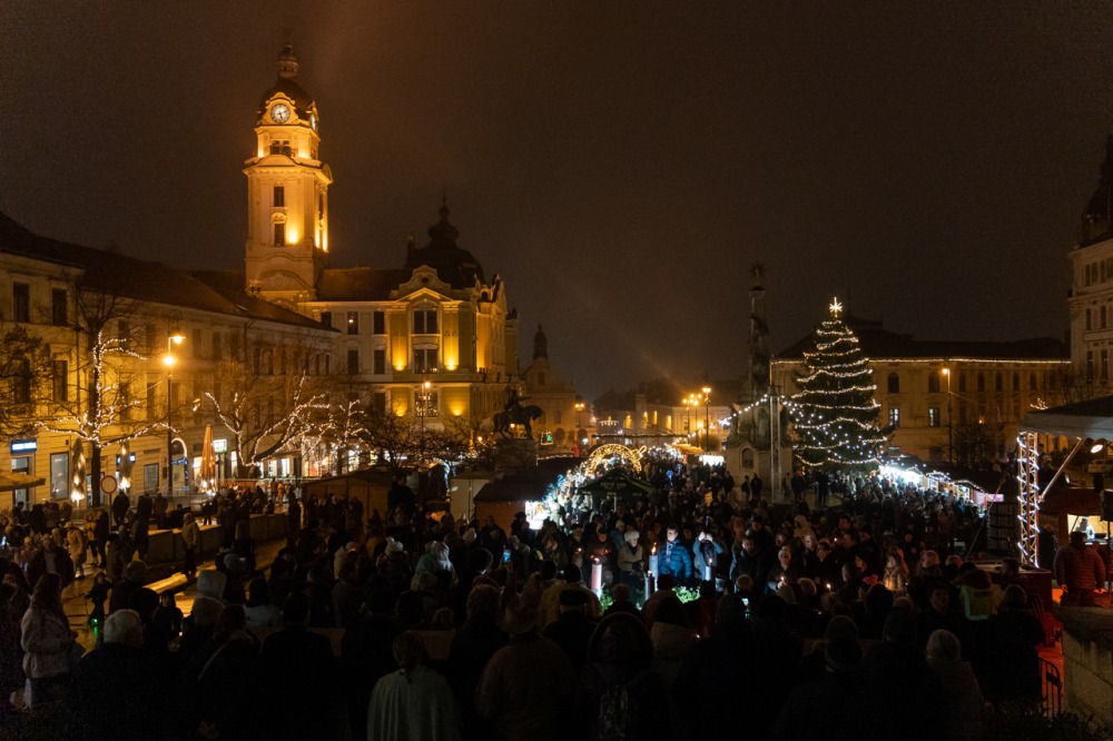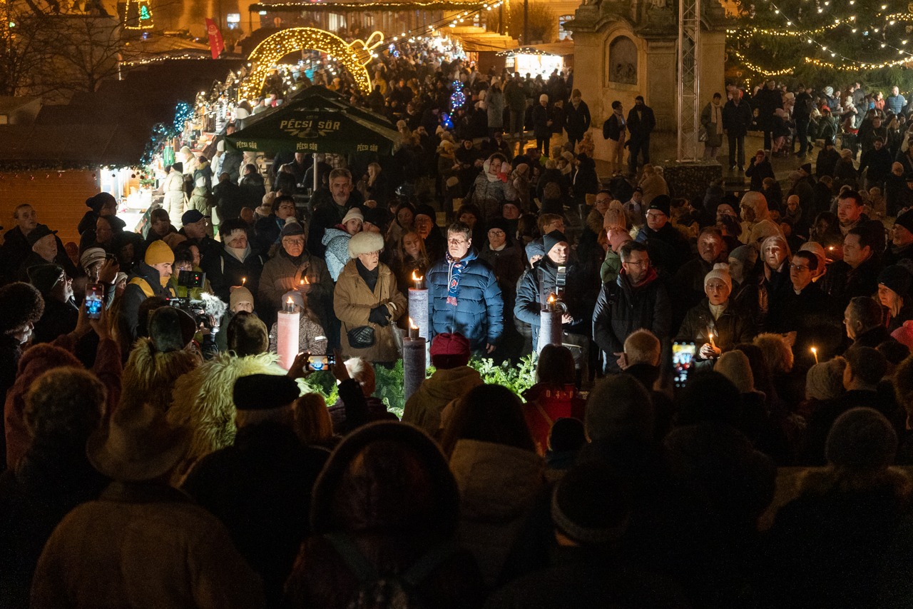 A zsúfolásig megtelt Széchenyi tér adventi forgatagában megtartott gyertyagyújtás előtt Felföldi László pécsi megyéspüspök rövid köszöntőjében elmondta, a karácsonyra való készület egyik nagy titka, hogy az ünnepet együtt, közösségben éljük meg.