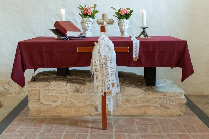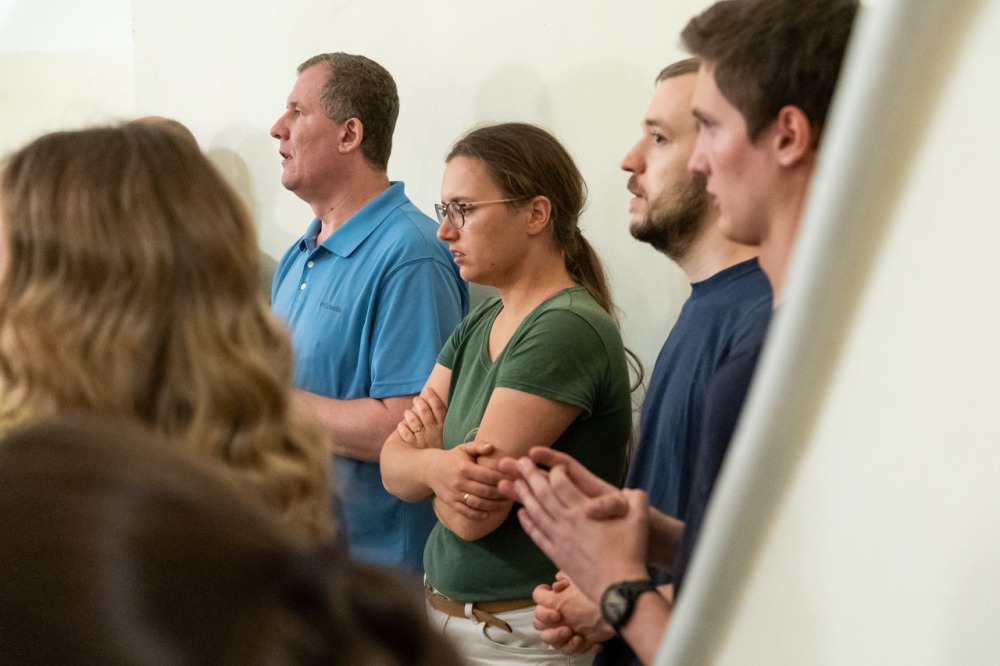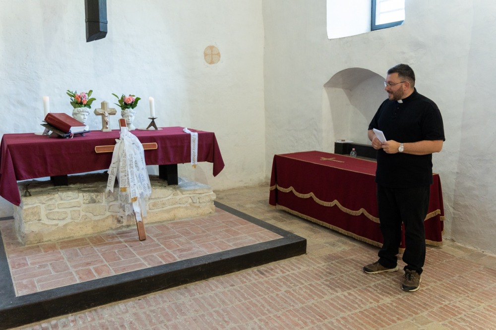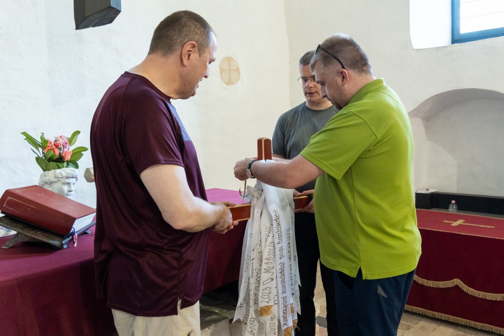 Püspökszentlászlón a zarándokmisét Mihovics Szebasztián újmisés mohácsi káplán celebrálta, akit éppen egy évvel ezelőtt, 2024. június 22-én szentelt pappá Felföldi László pécsi megyéspüspök. A papi hivatásokért felajánlott liturgián koncelebrált a jelenlévő papság, akik nevei szintén olvashatók a zarándokkereszt szalagjain.