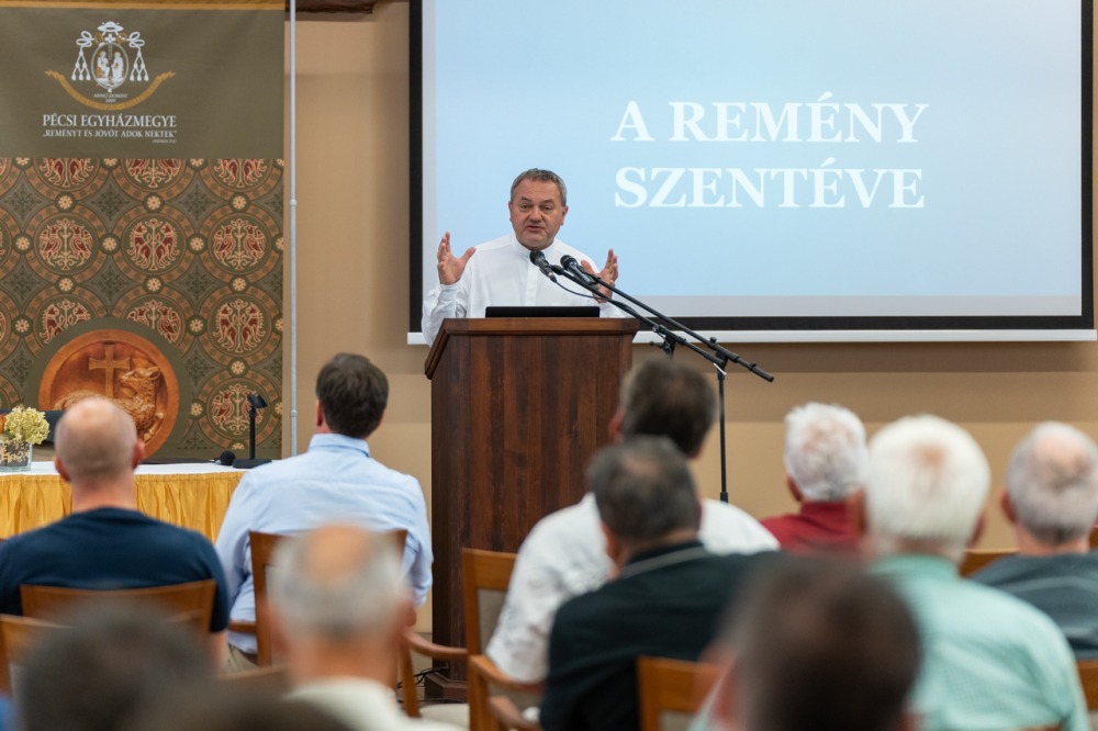 Felföldi László pécsi megyéspüspök, a férfitalálkozók ötlet- és állandó házigazdája előadásában az Isten által nekünk adott személyes és egyedi küldetésünkön keresztül láttatta a remény témájának mélyét. Mint elmondta, Istennek az a vágya, hogy az ember megtalálja ezt a küldetést és megvalósítsa saját életében, még akkor is, ha néha abba az újratervezést is bele kell kalkulálni. Ezt mutatja a remény szentévének megnyitását jelképező szent kapu, melyen átlépve valami elkezdődik az életünkben, miként most elkezdődik az Egyház és a közösségek életében is.