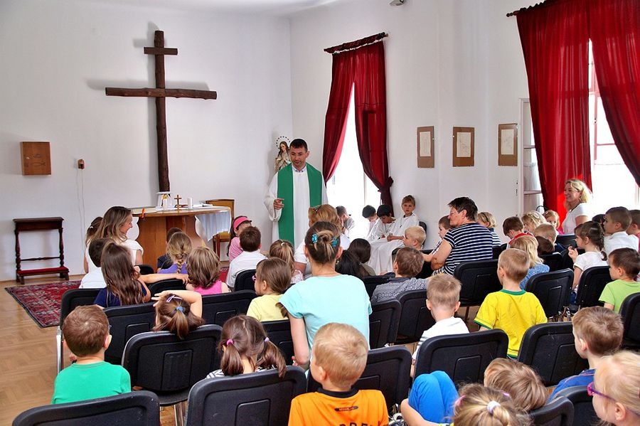 Június 8-án délelőtt a Szent Mór Iskolaközpont Szent Kereszt Kápolnájában gyűltek össze közös hálaadó szentmisére az óvoda kis-, középső és nagycsoportos óvodásai, óvónői és dajkái.