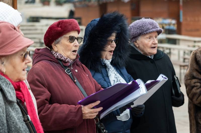 A Pécsi Egyházmegye fenntartásában működő Szent Lőrinc Gondozóotthon lakóinak kórusa énekelt Pécsen, a Széchenyi téren felállított karácsonyfa és betlehem mellett december 3-án.