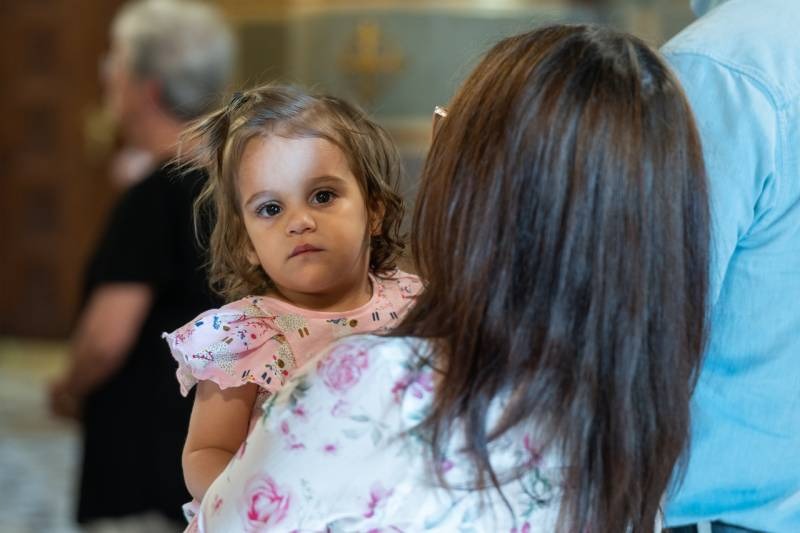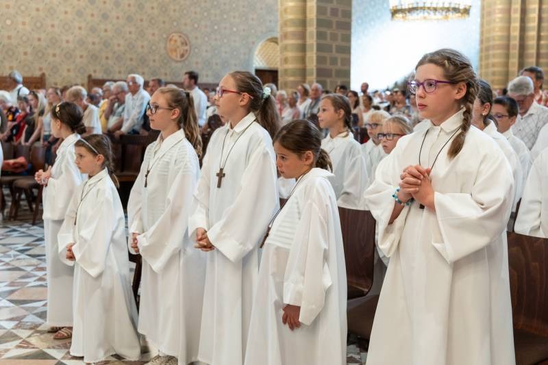 A körmenet útvonalán ünneplőbe öltözött elsőáldozók Krisztus iránti szeretetük és tiszteletük jeleként virágszirmot szórtak az Oltáriszentség elé.