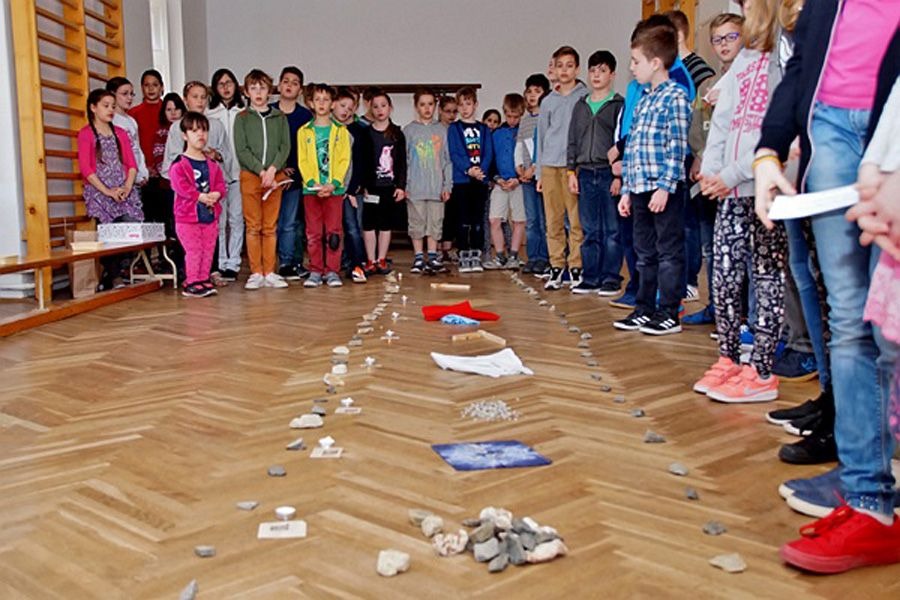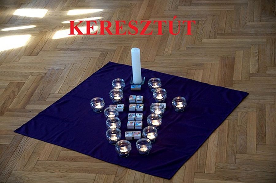 A hittanárok és a tanítók Köcsky Tiborné vezetésével érdekes, változatos, interaktív és lelki elmélyülésre is alkalmas programokat szerveztek az alsósoknak. A gyermek keresztút alapötletét Nagy Zoltán munkája adta. Minden állomásnál egy lezárt gyufásdoboz rejtett egy-egy jelkép értékű tárgyat: apró korbácsot, pici kendőt Jézus arcával, szeget, követ, homokot, pici fagerendát, INRI feliratos lapocskát, stb. A kinyitott skatulyákat végül egy-egy égő mécsessel együtt a kápolnában meglévő keresztúti stációk elé helyezték. Padlóképes keresztutat tavaly építettek először az iskolában. Igazán szemléletes és a gyerekek életkori sajátosságainak megfelelő alkotás a Joseph Kett által kidolgozott módszer alapján összeállítható, hozott anyagból készült, padlón elterülő keresztút.