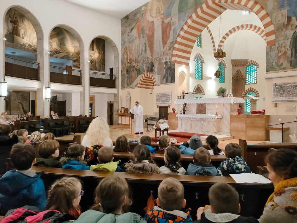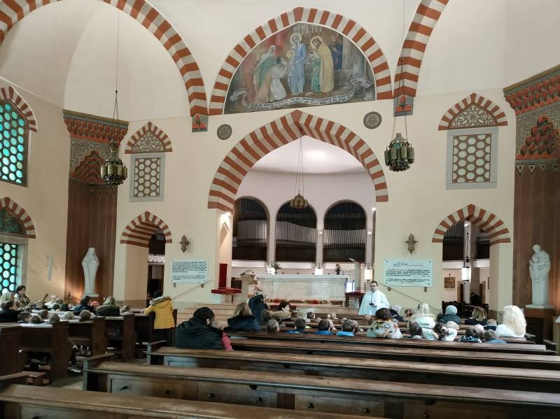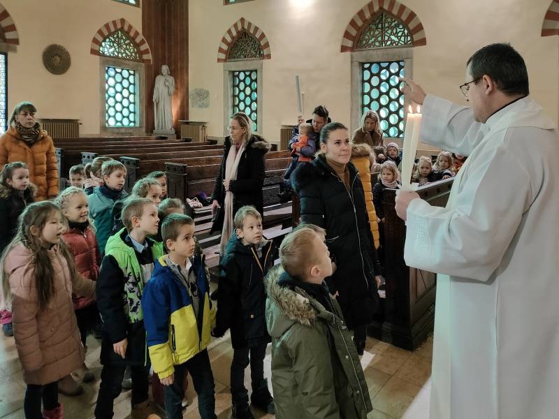 A Szent Mór óvoda közössége hagyományosan a dzsámiban gyűl össze minden évben Gyertyaszentelő Boldogasszony ünnepén. Ezen a napon arra emlékezünk, hogy negyven nappal születése után Mária és József bemutatta Jézust a jeruzsálemi templomban, ahol a bölcs, öreg Simeon a világ világosságának nevezte Jézust. A fény, a világosság jelképeit, az óvodások gondosan díszített kis gyertyáit dr. Kajtár Edvárd atya áldotta meg, majd az oltár túloldalán látható ikonikus freskóhoz vezette a gyerekeket. A közös elmélkedés során felidézte a történetet, majd imádság és egyházi énekek csendültek fel. Elfogadta felkérésünket Péteri Tibor, az Iskolaközpont zenetanára és gitáron kísérte a kis kórust.