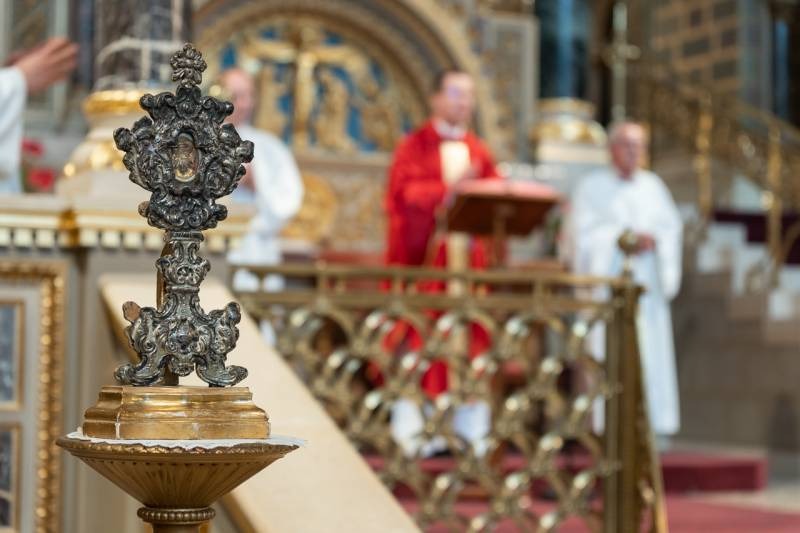 Kevésbé ismert, de a székesegyház két védőszentje közül Péter apostol a Pécsi Egyházmegye fő védőszentje is, akinek ereklyéjét a tisztelet jeleként megtömjénezték a búcsús liturgia kezdetén.