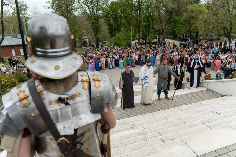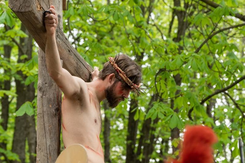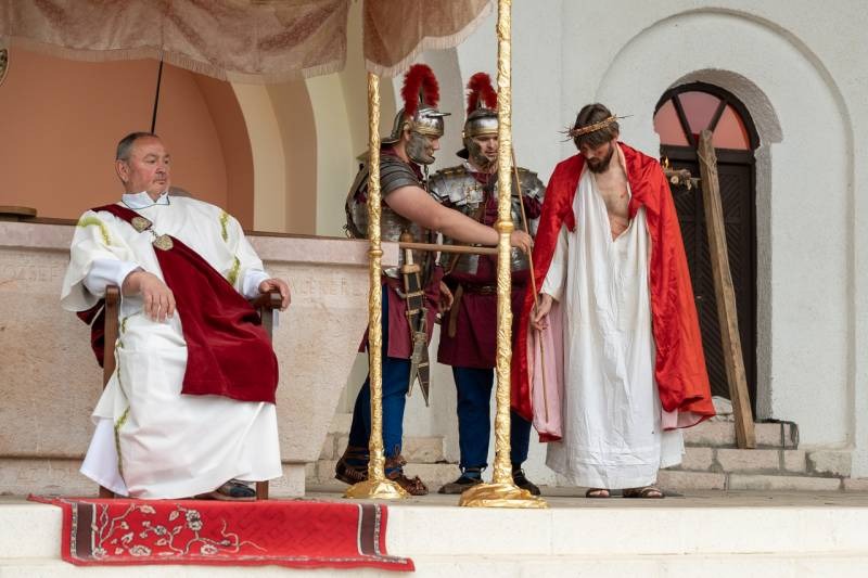 A Sarlós Boldogasszony-kegytemplomot körülvevő festői kegyhelyen megjelenített passióban a főpásztor Cirenei Simont, a plébános az első farizeust, Polgár Péter kántor pedig Poncius Pilatus római helytartót alakította. Jézust Nádudvary Csongor, a közösség tagja személyesítette meg.