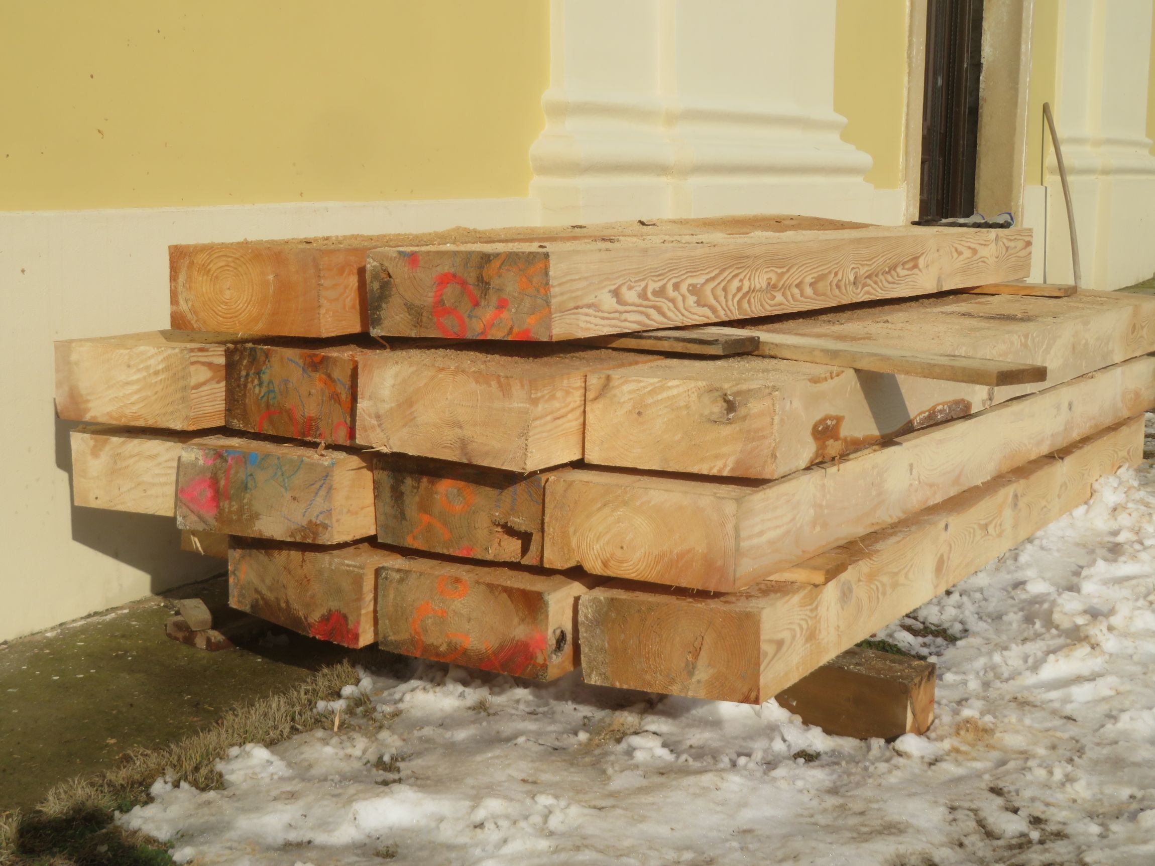 A munkálatok során előbb elbontják a födém deszkaborítását, majd kicserélik a károsodott gerendavégeket és megnövelt teherbírású acélszerelvényt építenek a fagerenda tetejére.