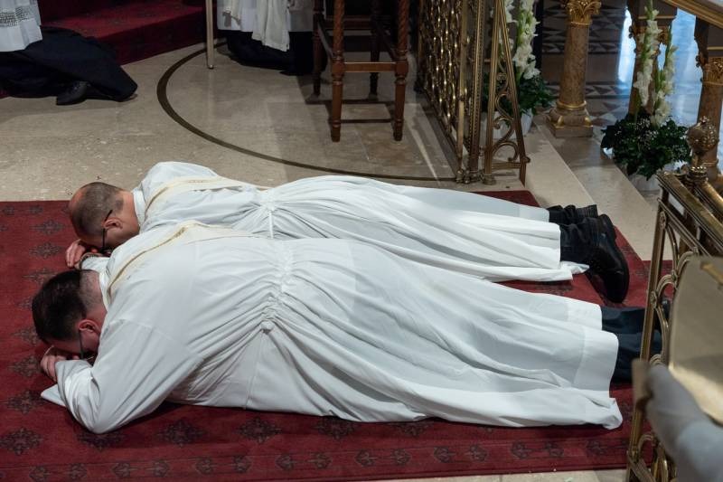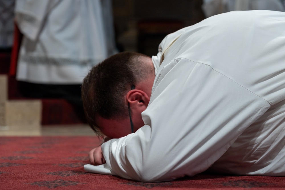 Ezután a jelenlévők elimádkozták a Mindenszentek litániáját, miközben a szentelendők a földre borulva fejezték ki Istennek való önátadásukat.