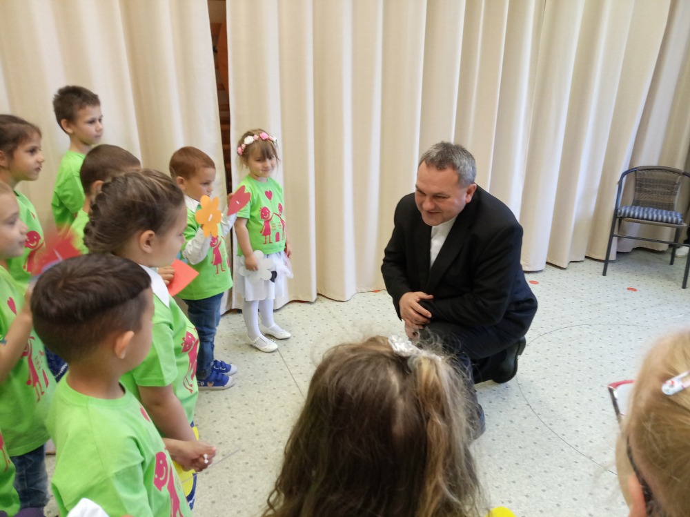 Püspök atyát az intézmény vezetője, Tóthné Károly Mónika köszöntötte. A látogatás meghívott vendége, dr. Hegedüs János plébános, püspöki biztos volt. A Napocska csoportos gyerekek köszöntő énekeit, verseit követően a német nemzetiségi Holdacska csoportba járó gyerekek járták el vidám táncukat, majd az óvoda magyar néptánccsoportjának népi gyermekjátékait tekinthették meg a vendégek. Püspök atya, miután bejárta az óvoda épületét, személyes beszélgetés keretében ismerkedett meg az óvoda dolgozóival, a benne folyó nevelési munkával és az intézmény jövőbeli terveivel. Elmondta, mennyire örvendetes számára, az óvoda dolgozói közösségére jellemző összefogás, az intézménybe járó gyerekekért való őszinte tenni akarás és szeretet, amely érezhetően áthatja a mindennapokat.