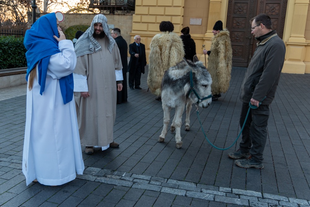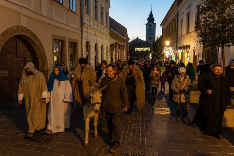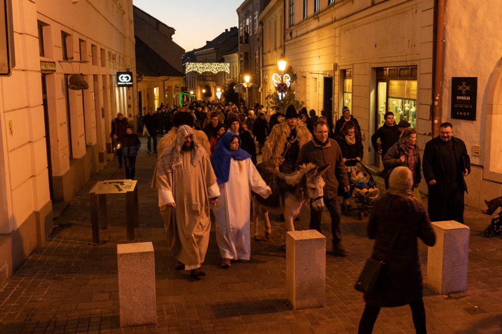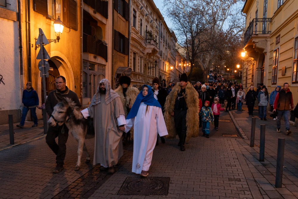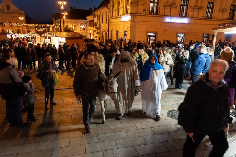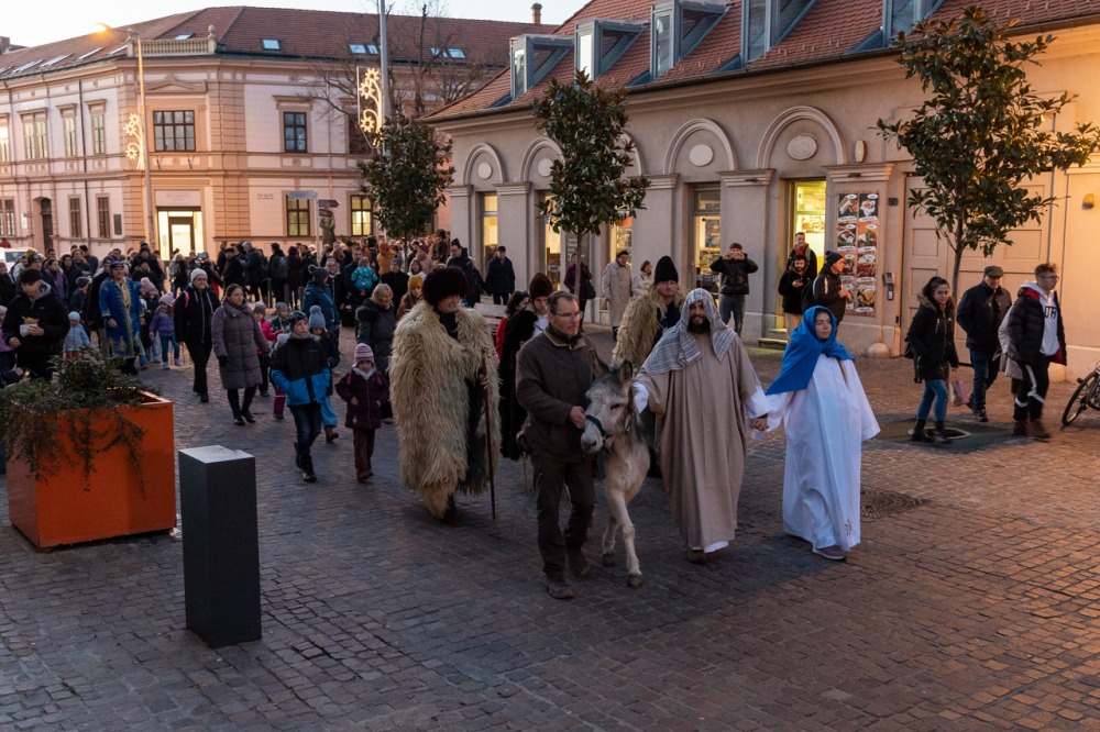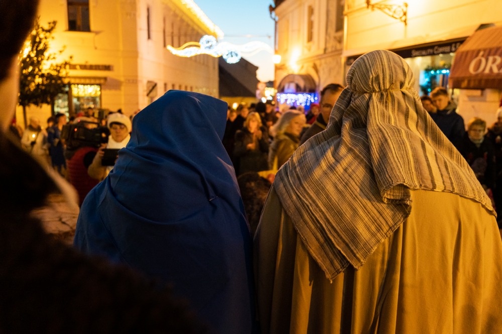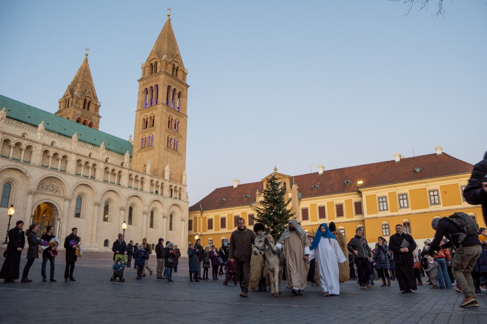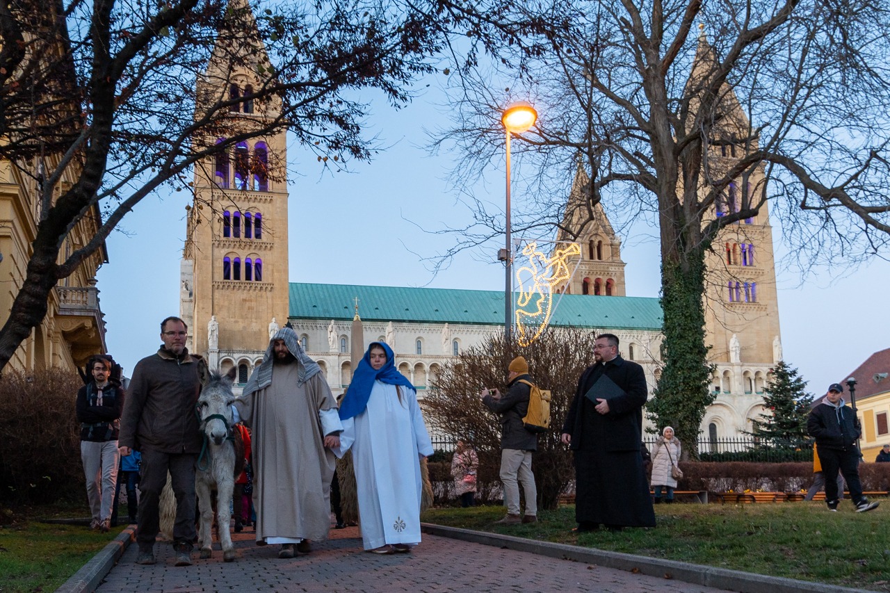 A júdeai Betlehemben szállást kereső Szent Család, Mária és József alakját, a pásztorokat és a napkeleti bölcseket személyesítették meg a misztériumjáték résztvevői. Az őket kísérő több száz fős menet, köztük rengeteg kisgyermek énekes-zenés ájtatosságban idézte fel a születés éjszakáján történteket december 21-én Pécs belvárosában.