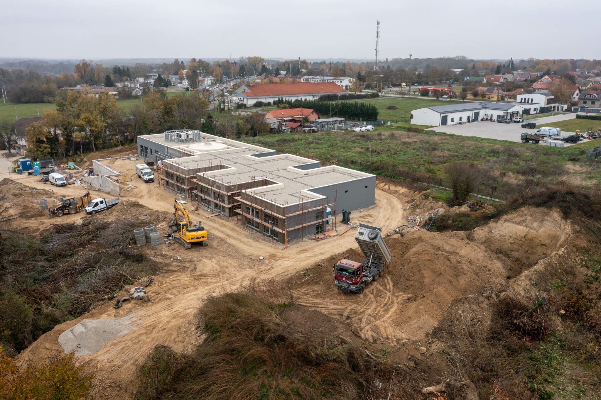 A projekt zöldmezős beruházásban Dombóvár nyugalmas, zöldövezeti részén egy 8276 négyzetméteres telken valósult meg. 2023 novemberében egy fákkal, bokrokkal dúsan benőtt délről északi irányba lejtő munkaterületet vettek át a kivitelező cég szakemberei. Az építést megelőzően megtisztították a területet a bozóttól és elvégezték az épület geometriai kialakításának megfelelően a tereprendezési munkákat. Utóbbi – árulta el Ihász László – mintegy 7000 köbméter föld megmozgatását jelentette. A kitermelt föld egy részét az épület melletti tereprendezéshez használták fel, a többit egy lerakóhelyre szállították.